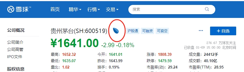 4. 确认安装成功。打开理杏仁贵州茅台详情页面,页面右上角可以看到雪球图标,如下: